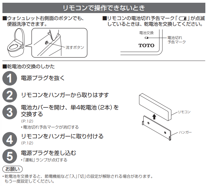 ・トイレ用や住宅用洗剤、ベンジン、シンナー、クレンザー、ナイロンたわしなどは使わない(故障やプラスチックを傷め、割れてけがや、給水ホースが傷むと水漏れの原因) - ウォシュレット本体