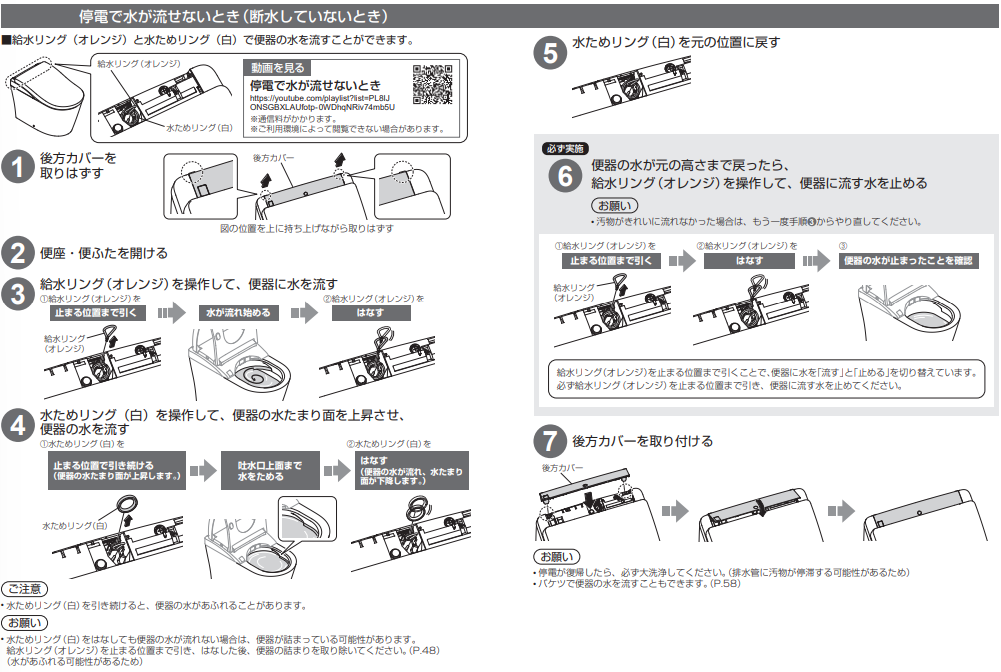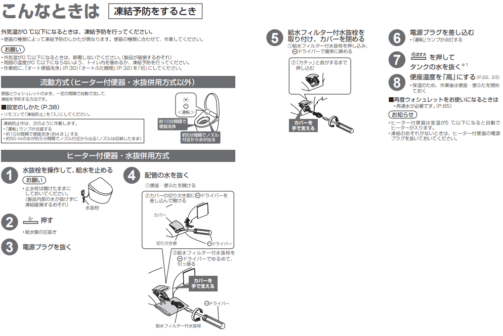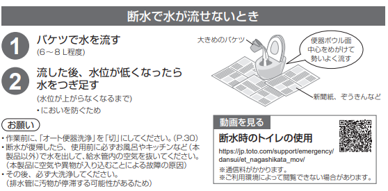・トイレ用や住宅用洗剤、ベンジン、シンナー、クレンザー、ナイロンたわしなどは使わない(故障やプラスチックを傷め、割れてけがや、給水ホースが傷むと水漏れの原因) - ウォシュレット本体